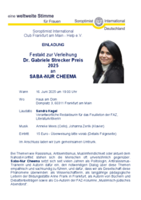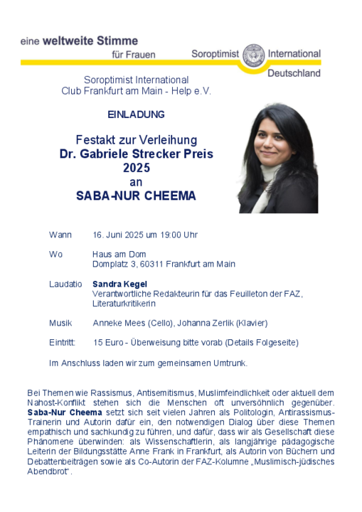 stehen sich die Menschen oft unversöhnlich gegenüber. Saba-Nur Cheema setzt sich seit vielen Jahren als Politologin, Antirassismus-Trainerin und Autorin dafür ein, den notwendigen Dialog über diese Themen empathisch und sachkundig zu führen, und dafür, dass wir als Gesellschaft diese Phänomene überwinden: als Wissenschaftlerin, als langjährige pädagogische Leiterin der Bildungsstätte Anne Frank in Frankfurt, als Autorin von Büchern und Debattenbeiträgen sowie als Co-Autorin der FAZ-Kolumne „Muslimisch-jüdisches Abendbrot.